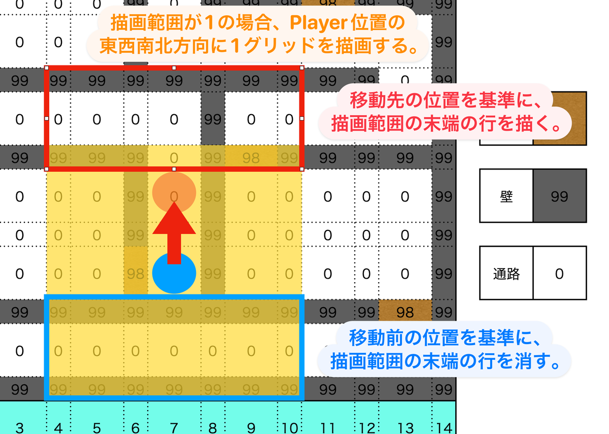 Playerの移動先の位置を基準に、移動方向の描画範囲の末端 1グリッド分を左右に描画範囲分新たに書き足して、