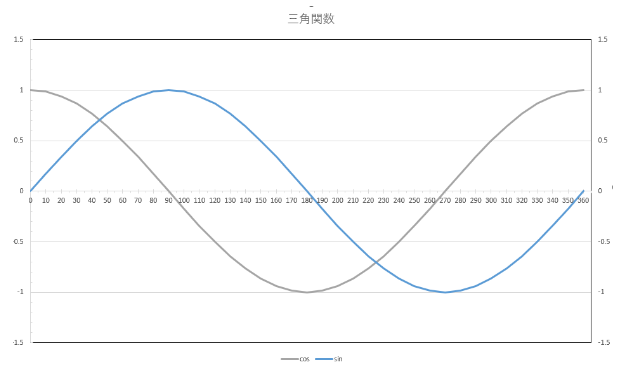 cosの場合、角度0°の時、cosは1から始まり、角度の増加と共に0に近づき、90°で0となる。