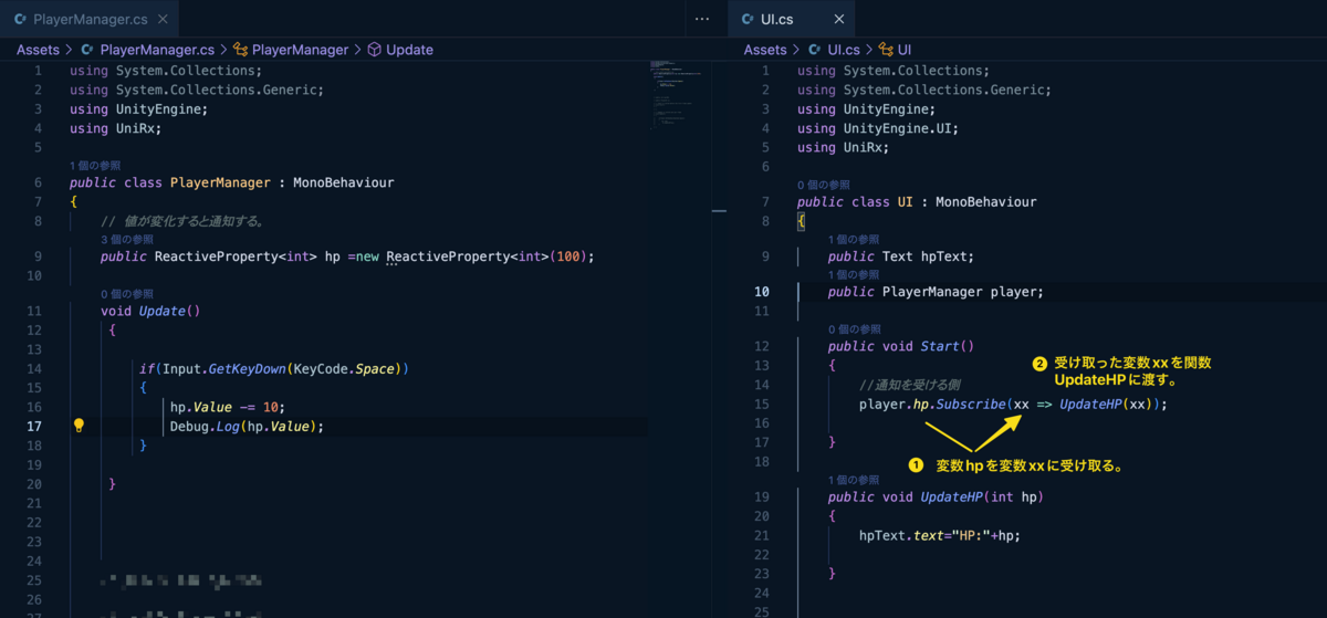 多分、PlayerManagerのReactivePropertyがSubjectに該当し、UIのSubscribeがObsrverに該当するのだろうか。