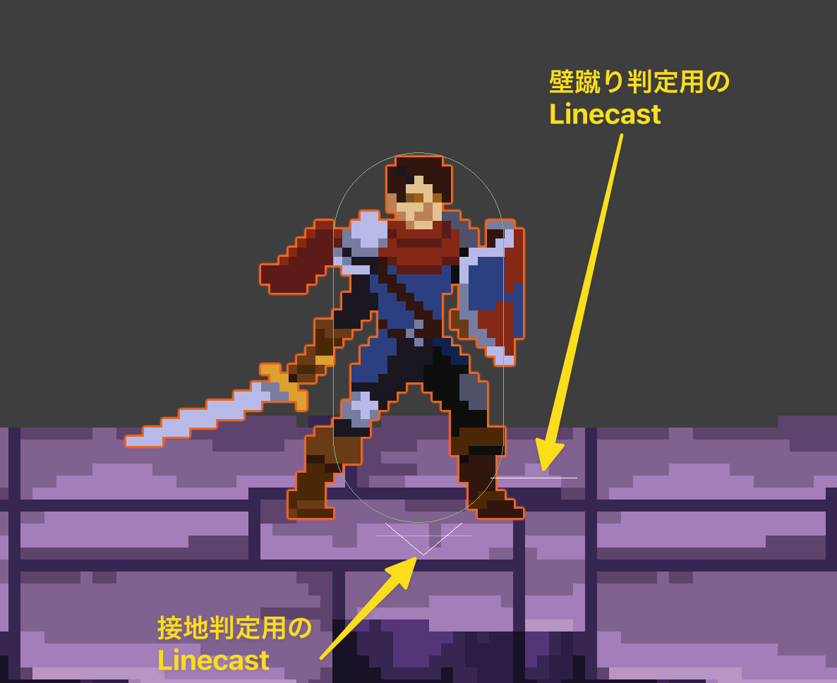 足元から壁検出用のLinecastを出すのは簡単ですが、どうしても壁にぶつかって、そのまま垂直ジャンプするだけになってしまう。