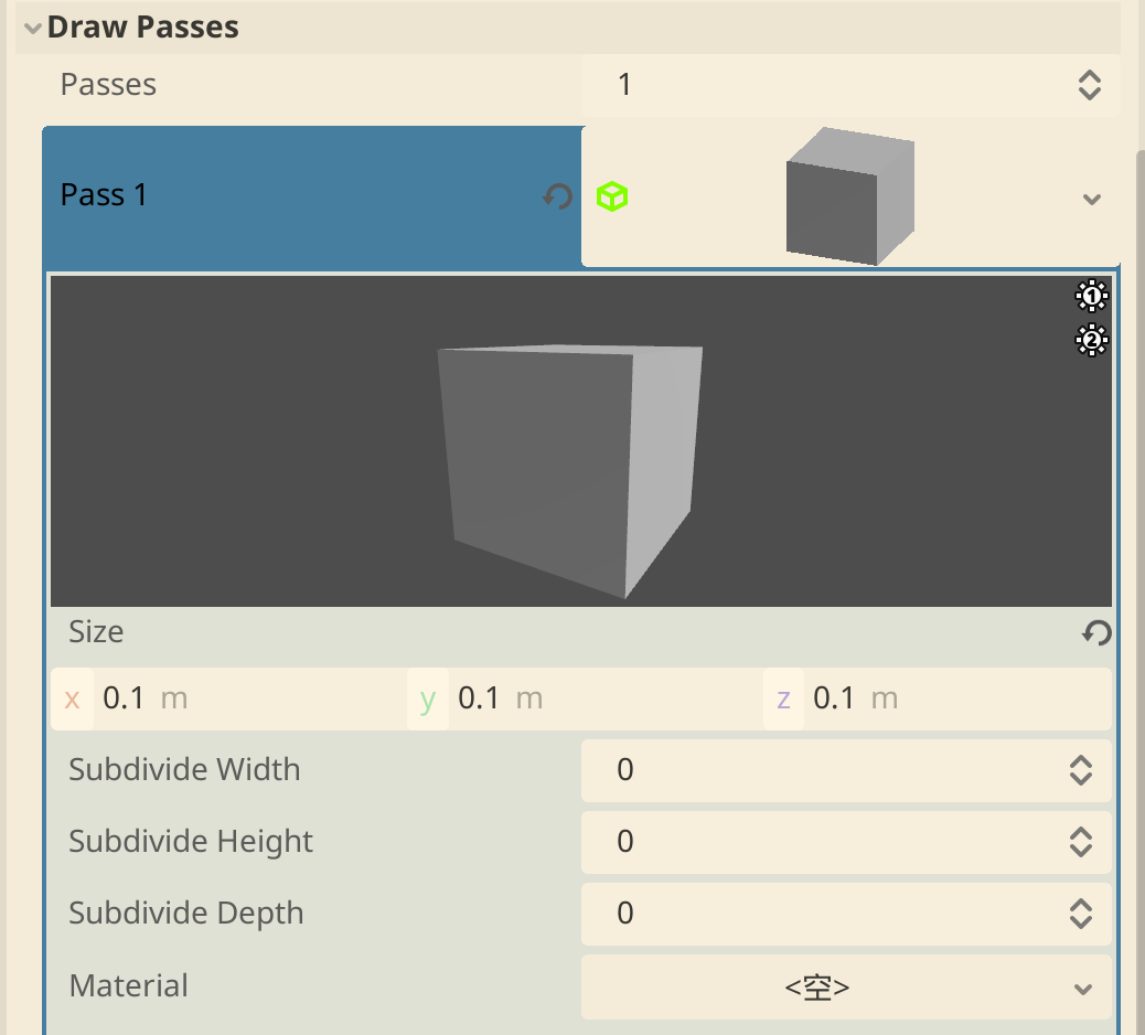 Draw Passesでパーティクルの形状を設定する。例ではBox Meshを選択し、大きさを0.1m四方に設定しています。