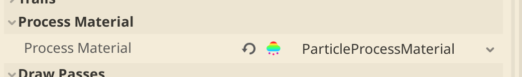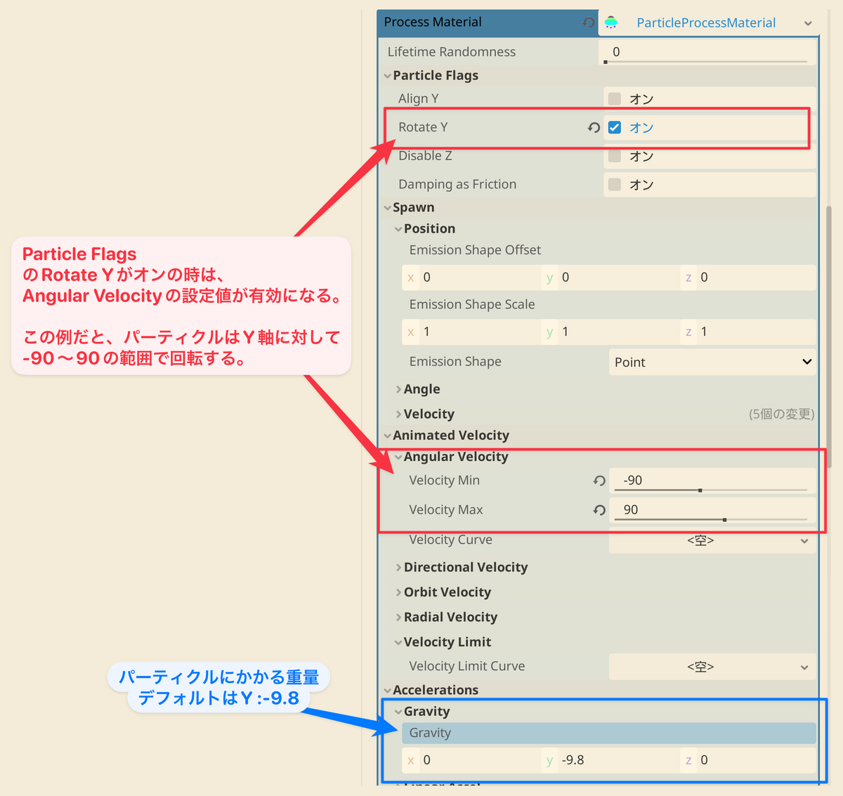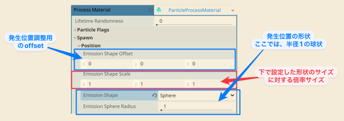まずはParticalProcessMaterialを選択し、そのParticalProcessMaterialに挙動を設定するイメージです。