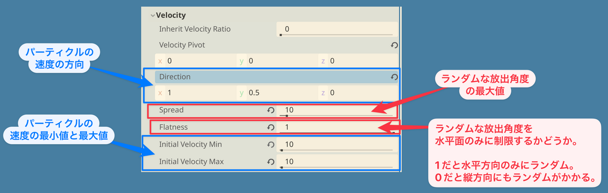 この例では、Directionを(x:1 Y:0.5 z:0)、Spraedを10、Flatnessを0、Initial Velocity MinとInitial Velocity Maxをそれぞれ10にしています。